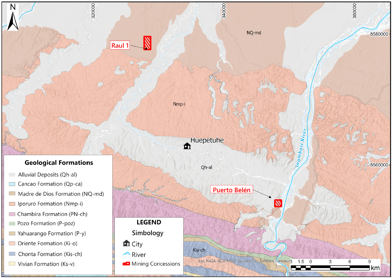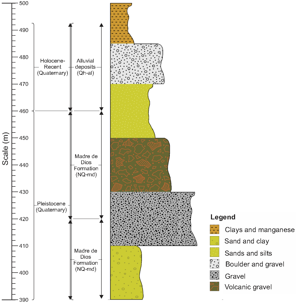 The Quaternary alluvial deposits of the Madre de Dios Department form part of the Amazonian plain, encompassing gold-bearing placer deposits associated with the Madre de Dios, Inambari, and Tambopata rivers (Velásquez Ramírez et al., 2020). These deposits originate from the Eastern Cordillera, specifically from the sub-Andean mountain range (piedmont), which is composed of Cretaceous and Tertiary sedimentary sequences. The main geological formations in this region are the Madre de Dios Formation (Miocene-Pliocene) and the alluvial deposits, along with the Mitu Group (Permo-Triassic) (Pérez Honores et al., 2003). Locally, these units are overlain by alluvial deposits (Lanckneus, 1991). The sediments in this region are derived from the erosion of Andean terranes, leading to the formation of placer deposits, which can be classified into two main types: (1) residual deposits, which remain near their source rock, and (2) transported deposits, which have been relocated by fluvial processes (Prater, 1957). The gold placers examined in this study belong to the Amazon hydrographic network. Specifically, the Puerto Belén mining concession is located within the Inambari river sub-basin, while the Raul 1 concession is within the Colorado river sub-basin (Figure 1), corresponding to the Masuco (27v) and Puerto Luz (26u) quadrangles, respectively. The lithostratigraphic units present in Puerto Belén include the Pliocene-Pleistocene Madre de Dios Formation (NQ-md) (Figure 2), composed of gravel, sand, silt, clay, and minor conglomerates with iron oxides. Additionally, alluvial deposits (Qh-al) are present on the west bank of the Inambari river, consisting of poorly sorted gravels, sands, silts, and mica clays. In the Raul 1 concession, the Madre de Dios Formation (NQ-md) is also present, containing clastic material with components of Neocomian age that indicate Early Cretaceous provenance, gray sands, and clays, along with alluvial terrace deposits (Qh-al), which consist of sands and gravels. The lithostratigraphic unit codes follow the stratigraphic classification of Galloso Carrasco et al. (1996).