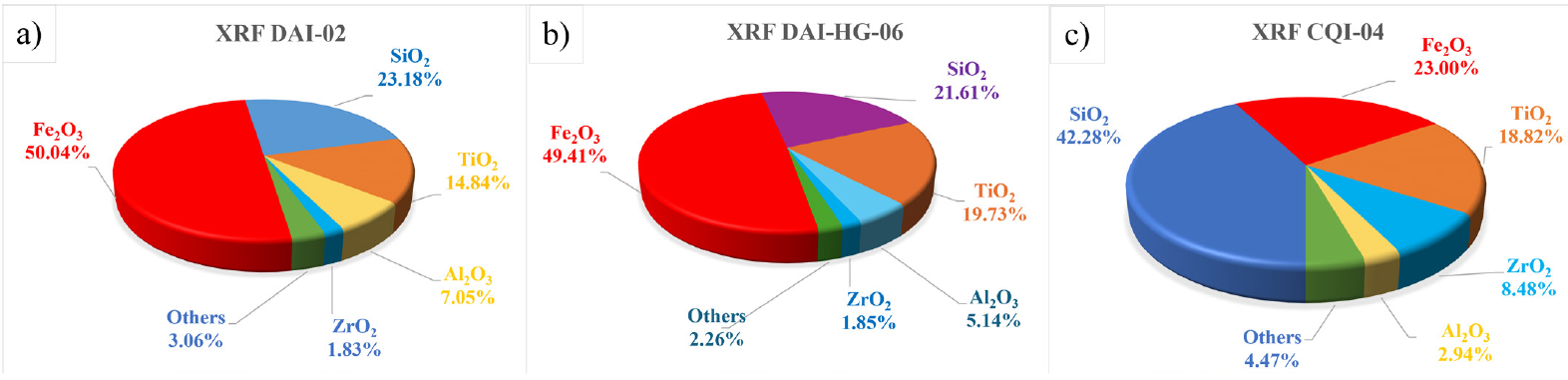 The XRF analysis of sample DAI-02 reveals a composition of 50.04 % iron oxides, 23.18 % silica, 14.84 % titanium, 7.05 % aluminum, 1.83 % zirconium, and 3.06 % minor oxides (including vanadium, manganese, tin, potassium, magnesium, cerium (CeO₂), niobium, phosphorus, yttrium (Y₂O₃), copper, and zinc) (Figure 4a). Sample DAI-Hg-06 contains 49.41 % iron oxides, 21.61 % silica, 19.73 % titanium, 5.14 % aluminum, 1.85 % zirconium, and 2.26 % minor oxides (manganese, vanadium, potassium, tin, magnesium, niobium, yttrium (Y), phosphorus, and zinc) (Figure 4b). Sample CQI-04 is dominated by 42.28 % silica, 23.00 % iron, 18.82 % titanium, 8.48 % zirconium, 2.94 % aluminum, and 4.47 % minor oxides (manganese, cerium (CeO₂), vanadium, neodymium (Nd₂O₃), potassium, lanthanum (La₂O₃), hafnium, phosphorus, tungsten, magnesium, yttrium (Y), niobium, and zinc) (Figure 4c) (Table 2).