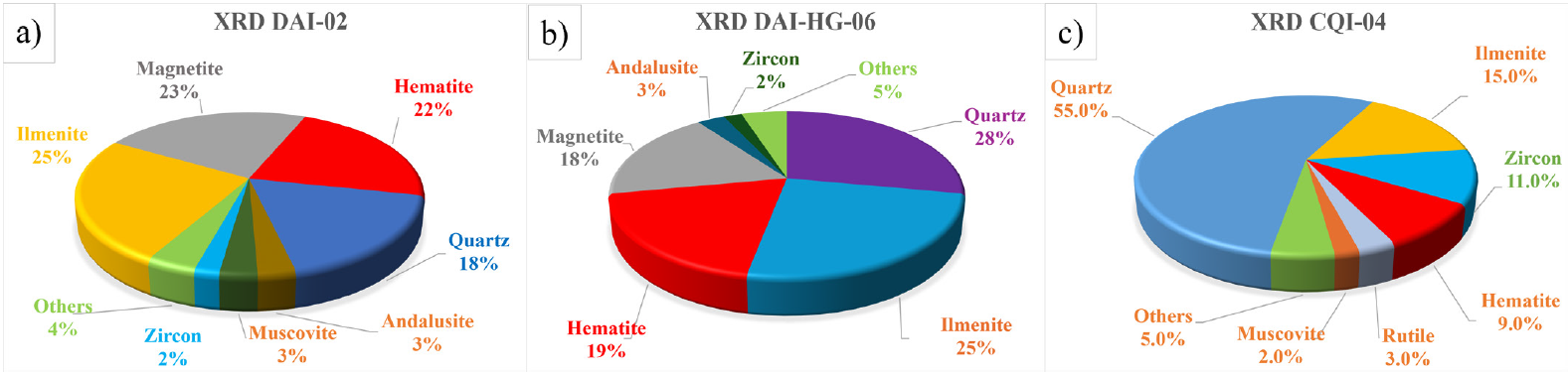 The XRD analysis of sample DAI-02 indicates a mineralogical composition of 25 % ilmenite, 23 % magnetite, 22 % hematite, 18 % quartz, 3 % andalusite, 3 % muscovite, 2 % zircon, and 1 % other minerals (including rutile, goethite, chlorite, and cassiterite) (Figure 5a). Sample DAI-Hg-06 consists of 28 % quartz, 25 % ilmenite, 19 % hematite, 18 % magnetite, 3 % andalusite, 2 % zircon, and 5 % other minerals (kaolinite, rutile, and muscovite) (Figure 5b). Sample CQI-04 is primarily composed of 55 % quartz, 15 % ilmenite, 11 % zircon, 9 % hematite, 3 % rutile, 2 % muscovite, and 5 % other minerals (kaolinite, andalusite, and monazite (Ce,La,Nd)PO₄) (Figure 5c) (Table 2).