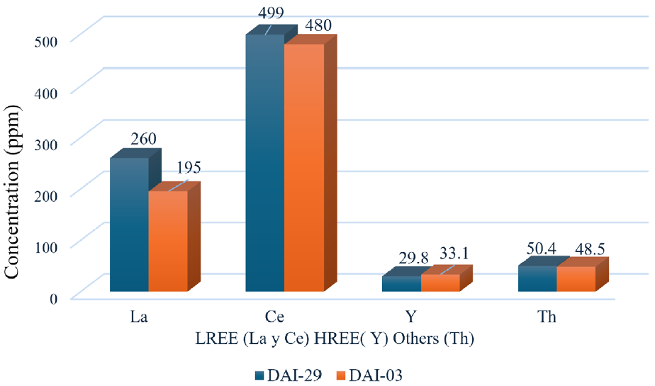 The ICP-MS analysis of samples DAI-29 and DAI-03 reveals the presence of light REE, specifically cerium (Ce) and lanthanum (La), with concentrations exceeding 500 ppm and 260 ppm, respectively. Additionally, heavy REE such as yttrium (Y) were detected, with anomalies of 29.8 ppm, along with thorium (Th) anomalies reaching 50.4 ppm (Figure 6; Table 2).