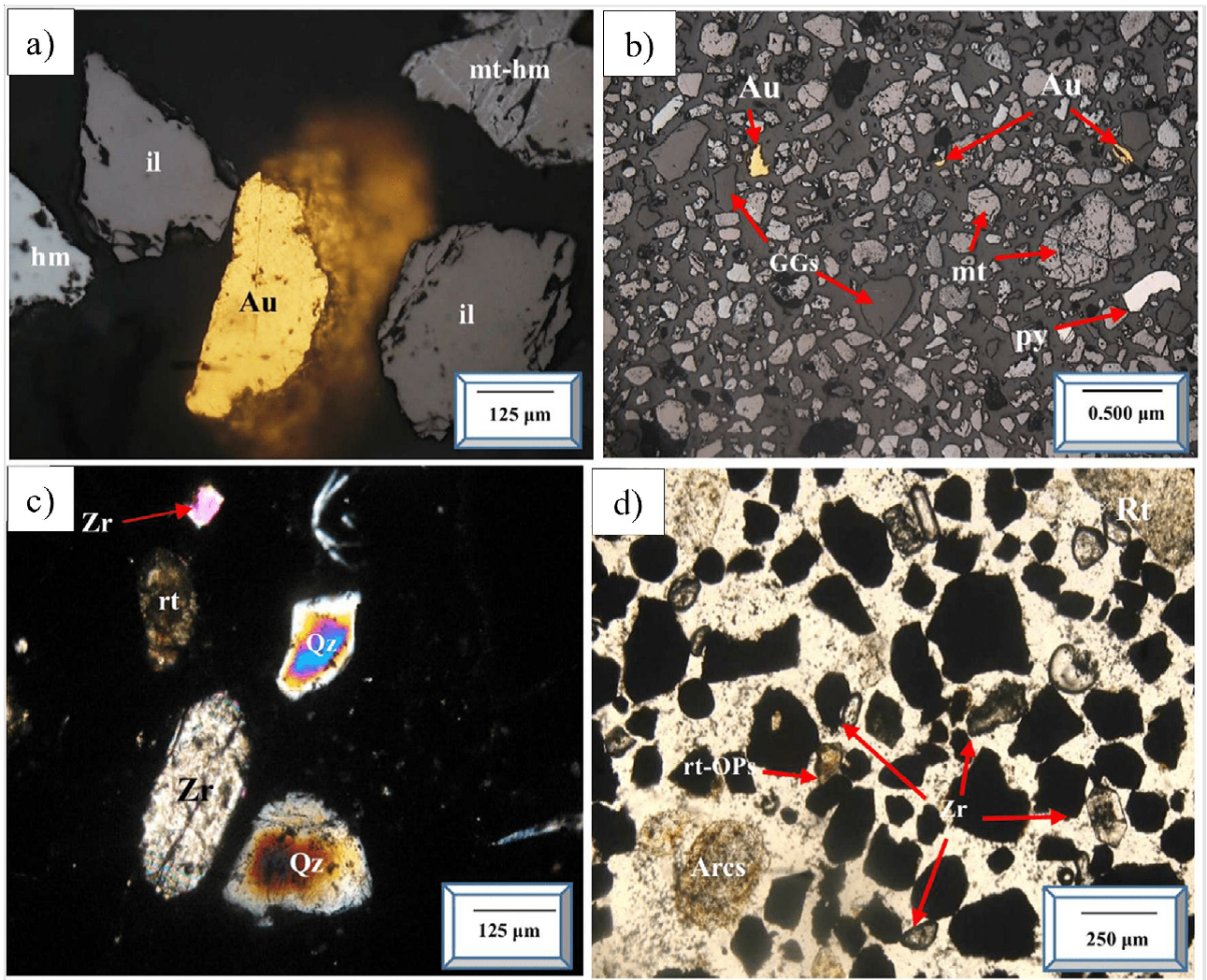 Figure 7 Photomicrographs of DAI-02 sample characteristic of the preconcentrate of the Puerto Belén concession. a). Free native gold particle (Au), ilmenite (il) and a magnetite (mt) particle replaced by hematite (hm), showing the process of martitization. b). Free native gold particles with sizes between 160 and 40 μm, associated with magnetite, hematite, pyrite (py) and gangues (GGs). c). Anhedral and free quartz particles (Qz), very high relief zircon grain (Zr), and rutile grain (rt). d). Exposure of trace minerals showing particles of euhedral zircon (Zr), clays (Arcs), rutile and mixed grain of rutile and opaque minerals (rt-OPs).