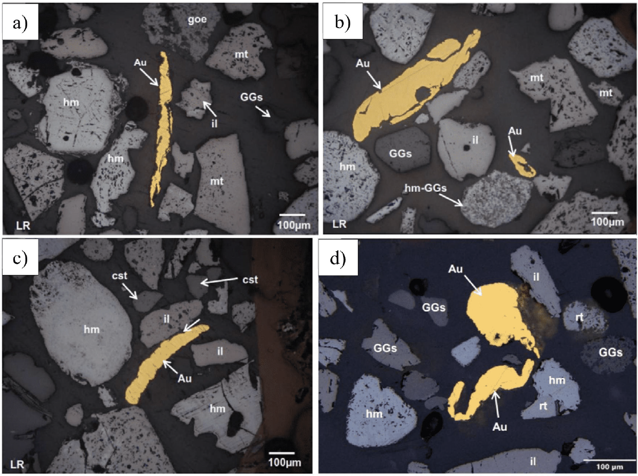 Figure 8 Reflected light photomicrographs showing the different morphologies of free native gold and associated minerals in samples from the Puerto Belén concession (6a, 6b) and the Raul 1 concession (6c, 6d). a) y b). Free native gold particles (Au) associated with iron oxides such as magnetite (mt), hematite (hm), ilmenite (il), goethite (goe) and gangues (GGs); c) y d). Free native gold particles associated with iron oxides and trace minerals such as rutile (rt) and cassiterite (cst).