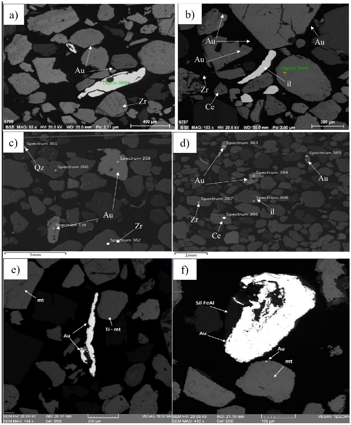 | Optical microscopy | Magnetite, Hematite, Quartz, Zircon, Gold | Gold observed within magnetite grains | Gold is mostly free, but some inclusions within iron oxides. | |