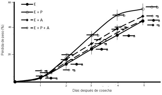 Figura 2 Pérdida de peso en frutos de rambután sometidos a diferentes manejos agronómicos. E = estrés hídrico, P = poda y A = anillado. Medias con la misma letra dentro de cada serie no difieren estadísticamente (Tukey, P ≤ 0.05).