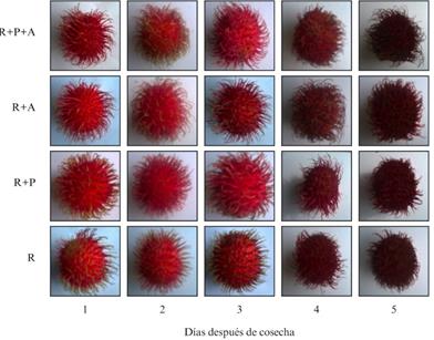 Figura 3 Oscurecimiento del pericarpio en frutos de rambután sometidos a distintos manejos agronómicos, almacenados a 30 ± 3 °C y de 80 a 90 % de humedad relativa. R = riego, P = poda y A = anillado.