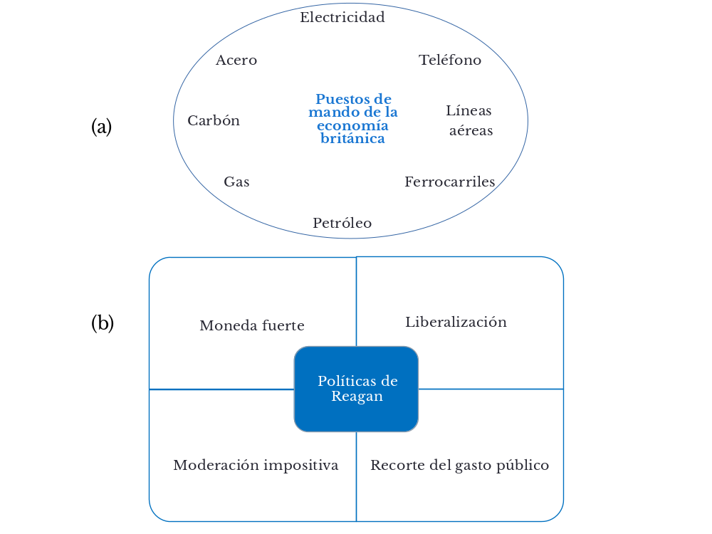 Las innovaciones en materia de política económica de Thatcher fueron las privatizaciones de empresas públicas (75% de las minas de carbón eran deficitarias), es así que los puestos de mando de la economía británica se pusieron en venta (véase figura 2a). En corto tiempo, dos tercios de la industria estatal pasó al sector privado (Barker y Cran, 2002). Lo ocurrido en Gran Bretaña fue replicado en Estados Unidos por Ronald Reagan en 1982, quien estuvo contra la doctrina keynesiana, que defendía la intervención estatal en épocas de crisis, y a favor del pensamiento de Hayek y Friedman, para quienes la intervención estatal debe ser mínima y no debe obstaculizar los intercambios en el mercado. La política de Reagan se componía de cuatro aspectos esenciales: contar con una moneda fuerte, liberalizar los mercados, moderar la política impositiva y recortar el gasto público (véase figura 2b).