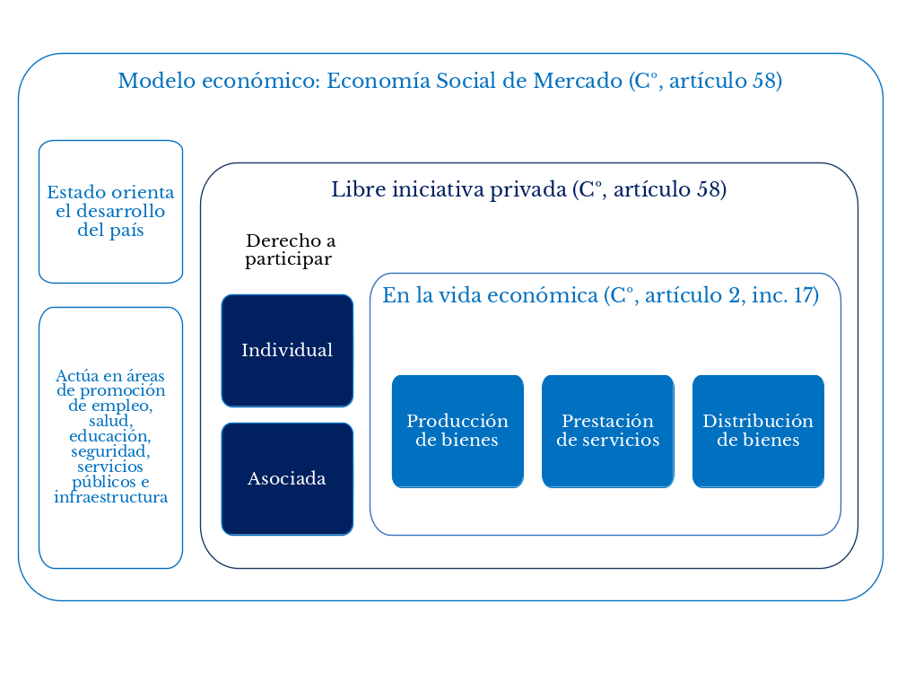 La constitución es bastante clara al instituir que el modelo económico constitucional peruano es una economía social de mercado. De este modo, si bien el modelo económico establecido en la constitución se rige por las reglas del mercado, su orientación implica que ante cualquier falla de mercado –falla de la competencia, mercados incompletos, presencia de externalidades, asimetría informativa, desempleo, inflación, etc.– el Estado interviene a través de medidas que, en general, se plasman en una norma. A su vez, la constitución económica de 1993 tiene como principio esencial la libre iniciativa privada, a través de la cual toda persona tiene el derecho de identificar e iniciar operaciones, con plena autonomía, la actividad o idea de negocio que prefiera, dentro de los límites que dispone la ley en una economía social de mercado. De ahí que las actividades que realicen las personas naturales o jurídicas, nacionales o extranjeras, respecto de la adquisición de activos, proyectos productivos, servicios, distribución de bienes u obras de infraestructura, pueden ser desarrolladas con la participación de los privados.