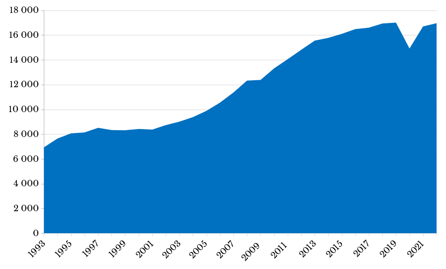 En términos reales, durante el periodo 1993-2022 el crecimiento económico peruano fue de 249%, resultado en gran medida de las normas establecidas en la constitución económica de 1993, que se caracterizó por contemplar un modelo económico sustentado en las reglas del libre mercado. De hecho, el pbi por habitante (pbipc) creció 145%, lo cual representó una mejora sustantiva en el nivel de vida (véase gráfica 1).