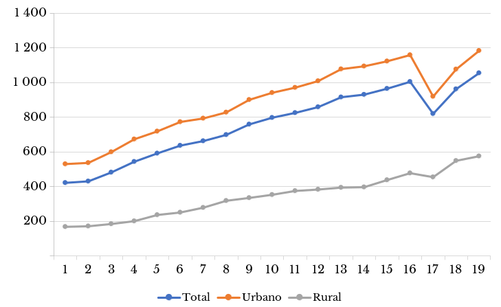 Así, se observa que si bien el ingreso mensual creció más en el ámbito rural (243%) que en el urbano (123%) durante el periodo 2004-2022, el ingreso mensualpc en el ámbito rural en el año 2021 está a la par del ingreso mensualpc para el año 2004, lo que muestra que existe una gran diferencia y retraso en la evolución del nivel de ingresos de la población. Sin perjuicio de ello, la tendencia de crecimiento nos muestra que se está avanzando lentamente en el cierre de brechas a nivel de ingresos. En este sentido, el ingreso mensualpc en el ámbito urbano es el doble del ingreso mensualpc que el rural, pues en 2004 esta diferencia era el triple.