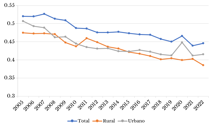 Asimismo, en el mismo periodo, se observa un descenso sostenido del coeficiente de Gini del ingreso mensualpc tanto en el ámbito rural como en el urbano, lo cual evidencia que existe menos desigualdad en los ingresos de la población que reside en el ámbito rural que en el urbano.