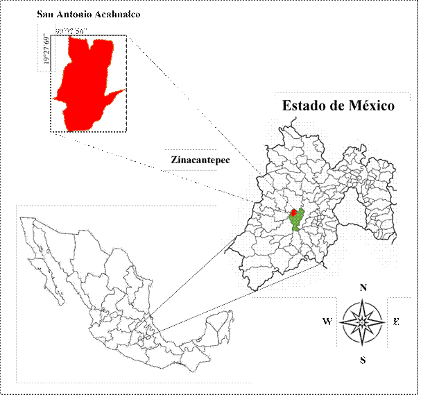 El estudio se realizó durante el 2017 en San Antonio Acahualco, municipio de Zinacantepec, Estado de México, México (Figura 1). Se localiza al suroeste de la Zona Metropolitana de la Ciudad de Toluca (ZMCT), a una altitud de 2, 810 msnm, su clima es templado subhúmedo con lluvias de mayo a octubre (PDM, 2022). El área de asentamientos humanos está conformada por 228 ha. y la superficie de cultivos es de 1,467 ha. Además, una parte del ejido es bosque de pino, encino y oyamel con una superficie de 1,280 ha. La población total es de 17,709 habitantes (INEGI, 2020).