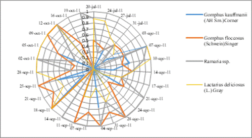 Lactarius deliciosus (enchilados) ocuparon el primer lugar en estar presentes en el tianguis. En los cuatro meses presentó tres picos máximos, dos al inicio de la temporada de hongos, con períodos del 20 al 24 de julio; luego del 7 al 10 de agosto; y el otro fue al final del ciclo (28 de septiembre al 12 de octubre) (Figura 2). En segundo lugar, está la Ramaria spp. (patita de pájaro) cuyo inicio de venta fue del 7 al 10 de agosto y su máxima presencia fue del 21 de agosto al 14 de septiembre (Figura 2). Para el caso de las Gomphus sp. (cornetas rojas) y Gomphus kauffmanii (cornetas blancas) el inicio de venta fue a partir del 20 y 27 de julio respectivamente, las cornetas rojas tuvieron tres picos máximos de presencia (28 de agosto al 11 de septiembre, 18 al 25 de septiembre y del 9 al 12 de octubre). Estas especies tuvieron presencia continuamente durante los cuatro meses, algunos de sus picos máximos se traslapan y otros se complementan haciendo que la actividad de extracción aparezca como continua (Figura 2).