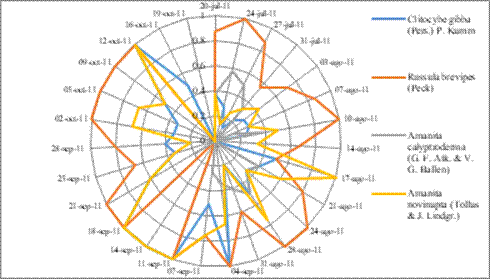 Russula brevipes (orejas) fueron los hongos de mayor presencia durante los cuatro meses, solo estuvieron ausentes el 14 de septiembre (Figura 3). Amanita calyptroderma (tecomates) fue la especie de menor presencia y período de venta (20 de julio al 21 de septiembre). La venta de Amanita novinupta (mantecadas) fue de manera cíclica con 5 picos de presencia, siendo el pico de máxima venta del 7 al 18 de septiembre (Figura 3). Contrario a Amanita calyptroderma (tecomates) que sólo están presentes al inicio de la temporada. La presencia de Clitocybe gibba (tejamanilero) se acentúa poco después que inicia la temporada y al final (Figura 3).
