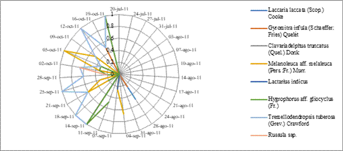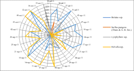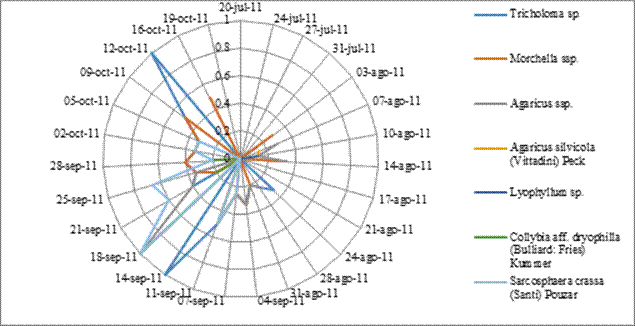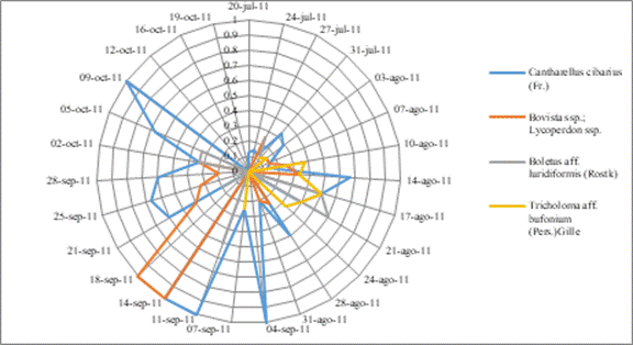 Cantharellus cibarius (duraznillo): el 14 de agosto empezó a incrementar su presencia y tuvo tres picos máximos (4 septiembre, 11 al 14 septiembre y 9 octubre) (Figura 5). Para el caso de Bovista spp. y Lycoperdon spp. (terneritas) sólo tuvieron un punto de auge (14 al 18 septiembre). El Boletus aff. luridiformis (galambos) y Tricholoma aff. bufonium (canarios o picudos) su presencia fue relativamente baja, por lo que es importante realizar trabajo de campo para identificar los motivos de su disponibilidad.