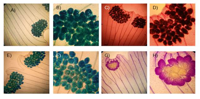 Figura 2 Pinna de Adiantum pedantum L. se aprecia la pinna con esporangios marginales en diferentes aumentos 4x (A, C, E, G) y (10x (B, D, F, H). A) Soros AT (30 min), B) Esporangio, AT (30 min), C) Soros ST (30 min) D) Esporangio ST (30 min) E) Soros AM (30min), F) Esporangio AM (30min), G) Pinna GV, H) Esporangio, GV.