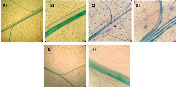 En la Figura 3 la tinción con AM en Pyracantha koidzumii presenta una coloración más clara en comparación con AT y TV, el AM tiñó con claridad las venaciones de la hoja, sin embargo, 30 minutos no fue suficiente para que se impregnará el colorante por lo que no se observaron con nitidez las paredes celulares.