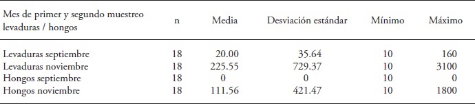 The assessment of yeast and fungi showed higher statistical mean and variability in November than in September (Table 3). The minimum yeast count was 10 in September and November.