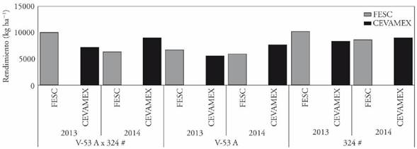 Figure 3 Yield of the non-conventional hybrid V-54 A x 324 # and its parents in four environments. Spring-summer cycle 2013-2014.