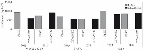 Figure 2 Yield of the non-conventional hybrid V-55 A x 324 # and its parents through four evaluation environments. Spring-summer cycle 2013 and 2014.