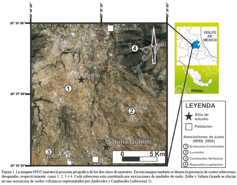 La imagen donde se localiza el área de estudio (Figura 1) denota que los sitios de Zethé y Sabina Grande se ubican sobre suelos de origen volcánico, probablemente Andosoles y Cambisoles con propiedades ándicas (subescena 1). Existen, además, en terrazas y pedimontes más antiguos, suelos arcillosos (subescena 2) que pueden estar representados principalmente por Luvisoles. Las planicies presentan suelos típicos de zonas áridas (subescena 3), como son Calcisoles y algunos Vertisoles, en tanto que las áreas con pendientes fuertes (subescena 4) se caracterizan por una predominancia de Leptosoles y Regosoles. Desafortunadamente, la imagen también muestra que el grado de antropización es muy alto en esta zona. Así, la deforestación es muy intensa y la erosión acelerada de tipo hídrica, es severa.