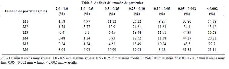 Análisis granulométrico. La Tabla 3 muestra la distribución del tamaño de las partículas que conforman la matriz de los adobes estudiados. Destacan en esta tabla los siguientes aspectos: (1) la clase textural de migajón franco domina en las seis muestras de adobe analizadas; (2) se observa que los tamaños de arenas finas, muy finas y limo son los constituyentes predominantes en la matriz de dichas muestras; (3) los porcentajes de arcilla varían de bajos (M1, M2) a moderados (M3, M4, M5 y M6), siendo que la mayor acumulación de arcilla apenas rebasa el 20 %; y (4) como se observa en la Figura 2, la distribución y porcentajes de los diversos tamaños de partícula resultan muy similares en todas las muestras. Con base en estas características de tamaño de partícula se puede inferir lo siguiente: