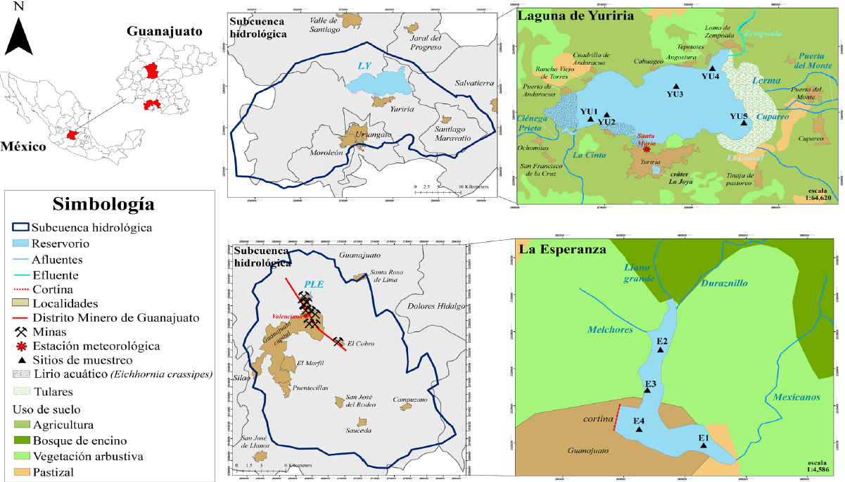 En particular, la Laguna de Yuriria (LY) y la presa La Esperanza (PLE) son dos reservorios que se encuentran en cuencas hidrológicas amenazadas por el crecimiento urbano y el desarrollo de distintas actividades antropogénicas (agricultura, ganadería e industria). Los principales usos que se les dan a la PLE y a la LY son el abastecimiento de agua para uso público urbano y el riego agrícola, respectivamente (SMAOT, 1998, 2005). En investigaciones limnológicas previas se ha reportado que la LY presenta un alto grado de eutrofización debido a los aportes de nutrientes y el reciclaje interno de N (Ventura y Retana, 1993; Espinal-Carreón et al. 2013; Zanor et al., 2023). En los últimos años, se ha evidenciado el aumento de la salinización como resultado de las escorrentías urbanas y agrícolas que generan partículas sólidas y que disminuyen la calidad del agua para la vida acuática (Zanor et al., 2023). Metcalfe y O'Hara (1992) realizaron la extracción de un núcleo sedimentario en el cráter La Joya (próximo a la LY; Figura 1) e identificaron episodios con aumentos en los aportes de nutrientes. Por su parte, la PLE se localiza dentro del Distrito Minero de Guanajuato (DMG; Figura 1), en la parte centro occidental del estado de Guanajuato (Ramos-Gómez et al., 2012). El desarrollo minero del DMG ha significado un auge en la economía regional generando por décadas gran cantidad de desechos mineros y un número importante de sitios contaminados en toda la región de influencia (Miranda-Avilés et al., 2009; Córdova de la Cruz y Esparza Claudio, 2016; Chaparro et al., 2020). Actualmente, sólo existen estudios de monitoreos ambientales contemporáneos de la LY (Espinal-Carreón et al., 2013; Zanor et al., 2023), mientras que para la PLE no existe ningún trabajo de investigación publicado.