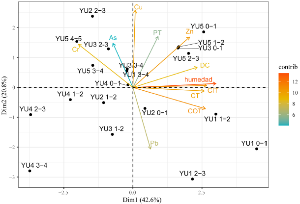 El biplot de composición muestra la relación entre los indicadores y los registros sedimentarios de la LY y la PLE (Figura 8). En el componente 1 se agruparon las muestras de la LY y los indicadores representados fueron DC, CT, COT, CIT, PT, contenido de humedad y As, con valores positivos, indicando una relación directa entre ellos. La asociación entre estos indicadores sugiere una productividad primaria alta causada por el enriquecimiento de nutrientes y el contenido orgánico a partir de las actividades humanas desarrolladas en la zona de influencia a la LY (Figura 8). Además, es importante señalar que los sitios que tienen mayor peso en los indicadores son los que se encuentran cercanos a las desembocaduras de los afluentes (núcleos YU1 y YU5) y el sitio cercano a la localidad Angostura que es un sitio de alta actividad gastronómica (núcleo YU3), contribuyendo con la descarga de aguas residuales sin un tratamiento previo. En cambio, el sitio YU4 mostró los contenidos más bajos en todos los indicadores analizados y tuvo un menor peso en el componente 1, ya que se encuentra cercano al efluente Zempoala (Figura 1). El PT y el As en los sedimentos de la LY serían aportados principalmente por fuentes antropogénicas relacionadas con el uso de agroquímicos, y particularmente el PT mediante las descargas de aguas residuales domésticas de las comunidades que habitan en las márgenes de la laguna.