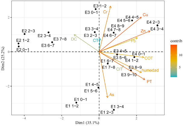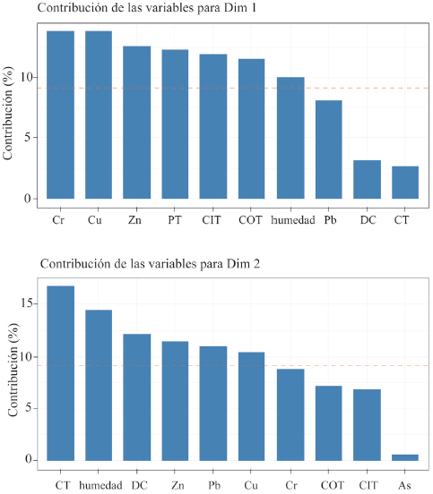 Con el objetivo de comprender las fluctuaciones de los indicadores en los registros sedimentarios de los reservorios LY y PLE se realizó un ACP para caracterizar el tipo de perturbación antrópica (minería, agricultura y urbanización). Los dos primeros componentes explicaron el 68.20 % de la varianza total. El componente 1 resultó el más importante, ya que explicó el 44.50 % de la varianza de los indicadores ambientales estudiados y el componente 2 explicó el 23.70 % de la varianza total. La Figura 7 muestra la contribución de las variables a los componentes principales, y la línea roja discontinua indica el valor medio de la contribución.