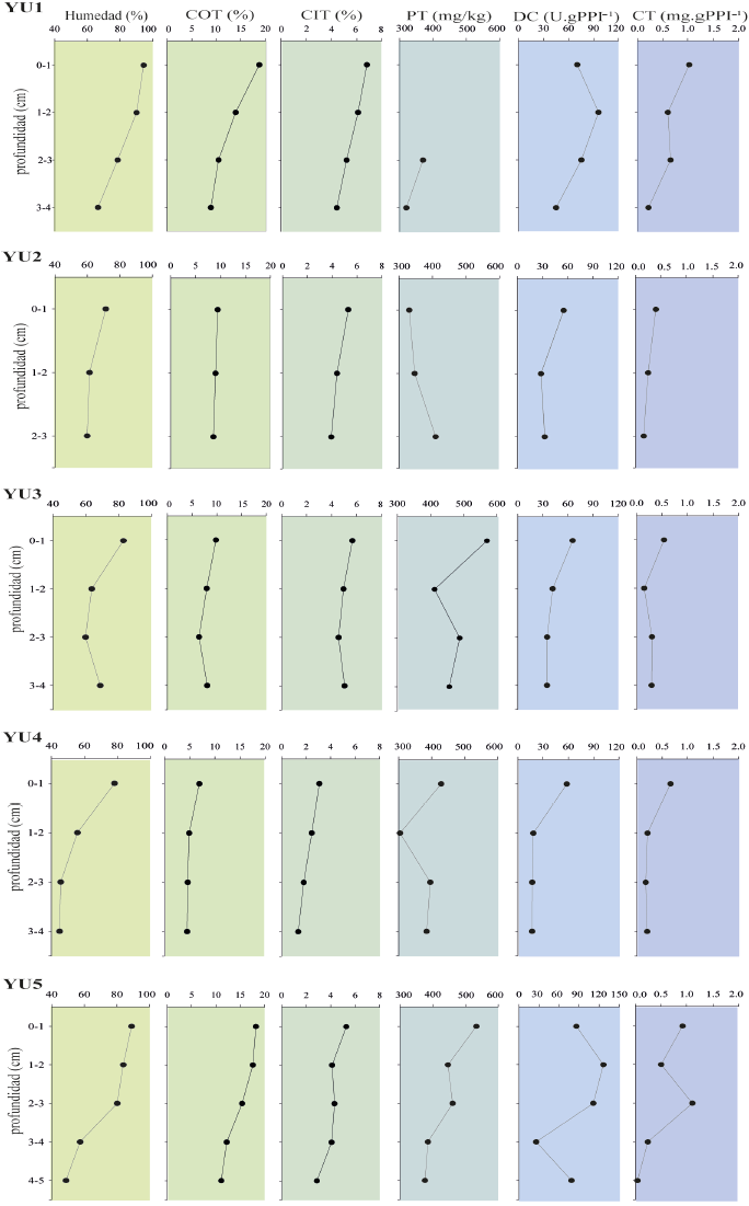 La distribución vertical de los indicadores ambientales determinados en los núcleos sedimentarios de la LY se muestra en la Figura 2. Los contenidos de humedad presentaron una tendencia creciente hacia los niveles superiores en los cinco núcleos sedimentarios. El valor de humedad más alto se registró en el nivel superficial del núcleo YU1 (máximo= 94.38 %; 0-1 cm), mientras que el valor de humedad más bajo se registró en los sedimentos inferiores del sitio YU4 (mínimo= 45.00 %; Figura 2).