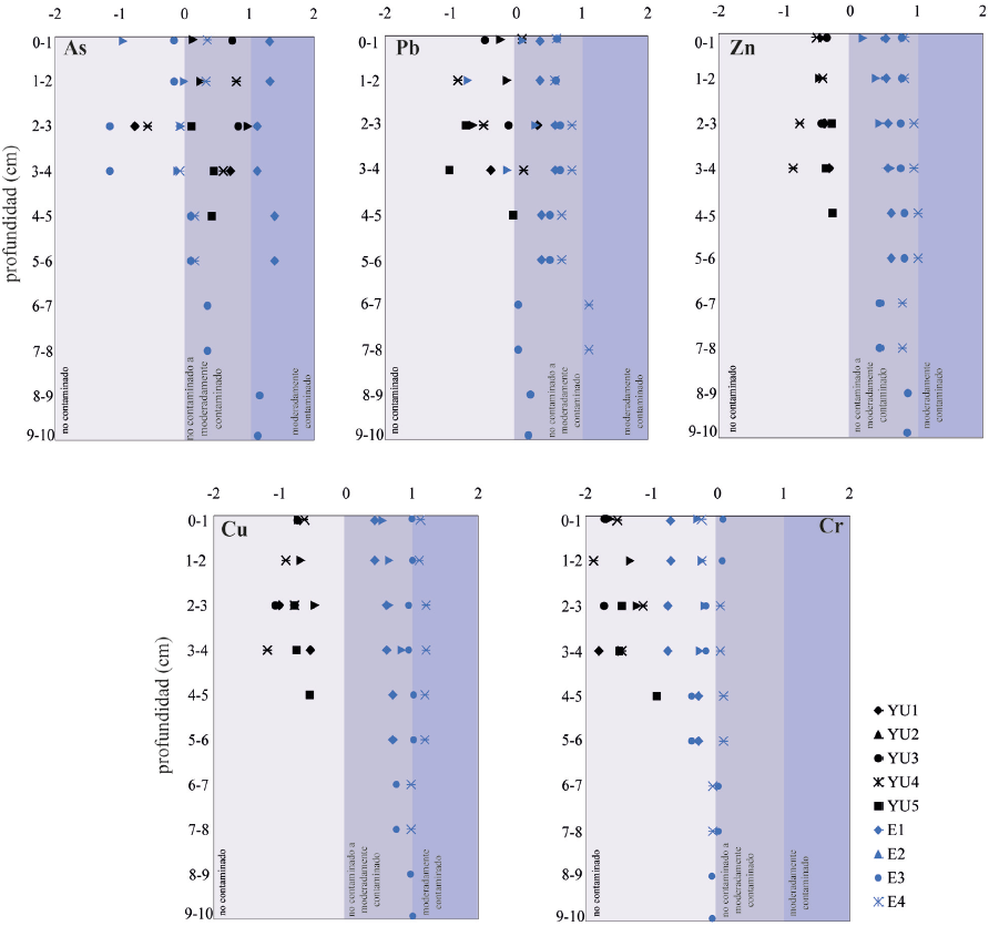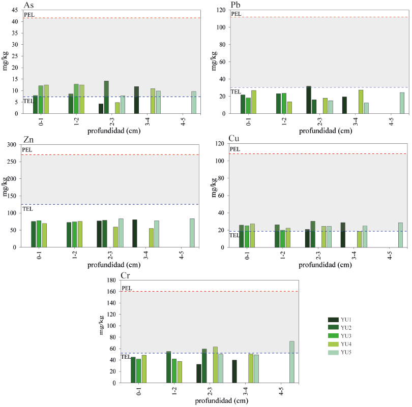 Por su parte, las concentraciones de Cu mostraron una variabilidad vertical entre 18.40 (YU4 3-4 cm) y 28.70 mg/kg (YU5 4-5 cm: Figura 3), con una concentración promedio más alta en el sitio YU2 (media= 26.84 mg/kg; Tabla 2). Las concentraciones de Cu sobrepasaron el valor TEL en la totalidad de los sitios y profundidades, lo que indica un posible efecto adverso para la biota acuática (Figura 3). Entretanto, los valores de Cr en todos los sitios y profundidades oscilaron entre 32.50 (YU1 2-3 cm) y 72.80 mg/kg (YU5 4-5 cm; Figura 3). De manera similar al Cu, el Cr de los sitios YU4 y YU5 estuvieron por encima del valor TEL, con el contenido más alto en la secuencia YU5 (57.47 mg/kg; Tabla 2). Sin embargo, los sedimentos de la laguna no se encontraron contaminados con Cu y Cr (Igeo < 0) y el FE de estos elementos traza resultó bajo (FE < 2). Es por ello que estas concentraciones se explicarían por una herencia litológica de las rocas basálticas que afloran en las zonas aledañas al sistema lacustre (Soto Araiza et al., 2002).