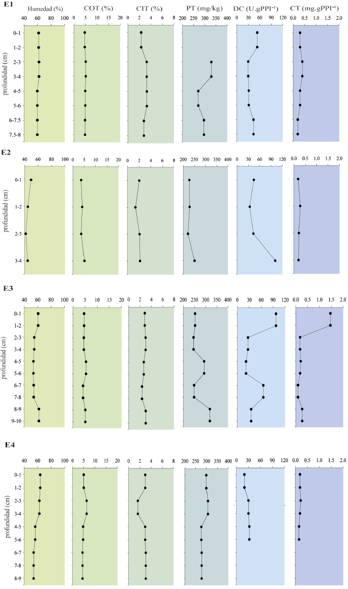 De manera similar al COT, los contenidos de CIT tuvieron una variabilidad vertical baja, con el valor máximo de CIT en el sitio E1 a 2-6 cm de profundidad (3.30 %) y un valor mínimo de CIT en E2 a 1-2 cm de profundidad (1.30 %; Figura 4). Con base en Gierlowski-Kordesch (2020), la depositación de carbonatos en los lagos es atribuida a cuatro procesos principales: 1) concentración a través de la evaporación, 2) bioinducción, generada por la alta productividad primaria, 3) entrada clástica a través del agua, y 4) transporte eólico. Las concentraciones relativamente bajas de CIT y COT en las secuencias de la PLE indicarían baja productividad y aguas menos concentradas (Vázquez-Castro et al., 2008). Además, la distribución CIT-COT vertical presenta una tendencia especular (cuando aumenta CIT disminuye COT; Figura 4) evidenciando que los procesos fotosintéticos no serían el proceso fundamental que explica la precipitación de carbonatos en la PLE (Teranes et al., 1999). Por ello, se puede considerar que el mayor aporte de CIT es producido por la entrada de escorrentías y el transporte eólico, procesos que han aumentado debido a la problemática de la deforestación en la cuenca. En cuanto a los DC y CT, se observó una distribución vertical similar, con variaciones desde 19.87 (E4 0-2 cm) hasta 101.00 U.g PPI-1 (E2 3-4 cm) y desde 0.09 (E3 6-8 cm) hasta 1.46 mg.g PPI-1 (E3 0-2 cm), respectivamente (Figura 4). En general, las secuencias sedimentarias muestran valores altos de DC y bajos de CT (Figura 4), lo que indicaría que las comunidades fitoplanctónicas aportan en mayor proporción a la producción primaria (Swain, 1985; Mengo et al., 2022).