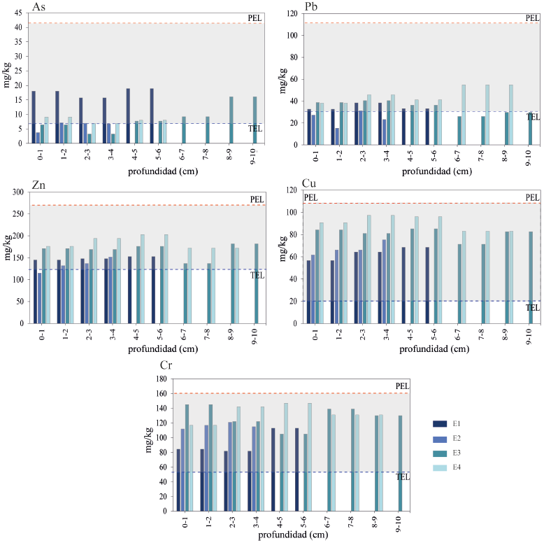 En el caso del Zn, los valores en todos los registros y profundidades variaron entre 115.00 (E2 0-1 cm) y 203.00 mg/kg (E4 4-6 cm), sin una tendencia específica (Figura 5), con una concentración media en la lateral de 184.67 mg/kg (E4; Tabla 3).