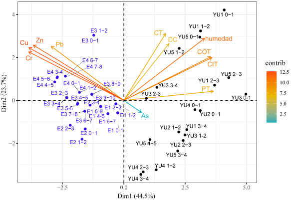 Figura 8 Biplot de la ordenación de los indicadores determinados en los núcleos sedimentarios de los reservorios estudiados. Contenido de humedad (humedad), carbono orgánico total (COT), carbono inorgánico total (CIT), fósforo total (PT), derivados de clorofila (DC), carotenoides totales (CT), As, Pb, Zn, Cu y Cr de los núcleos sedimentarios. En color negro se presentan las muestras a distinta profundidad de los sedimentos de la Laguna de Yuriria. En color azul se presentan las muestras a distinta profundidad de los sedimentos de la presa La Esperanza.