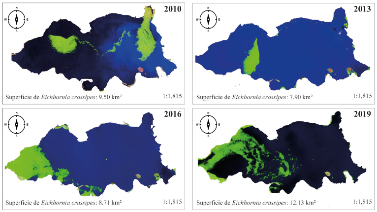 Se ha documentado que un patrón de aumento en las concentraciones de pigmentos fósiles en sedimentos lacustres se puede asociar con una mayor productividad primaria (Makri et al., 2019; Halac et al., 2020), debido a que los productores primarios responden rápidamente a los cambios en una amplia gama de condiciones ambientales, especialmente en cuanto a la disponibilidad de nutrientes (Makri et al., 2019). Efectivamente, la LY recibe aguas residuales y escorrentías agrícolas con altos contenidos de nutrientes y materia orgánica, lo que impulsaría el crecimiento algal y el incremento de la productividad primaria. Los sitios YU1 y YU5 en las capas más superficiales (0-1 cm) presentaron tendencias opuestas en relación a las concentraciones de pigmentos fósiles, mientras los DC disminuyeron los CT aumentaron (Figura 2). Estudios previos demostraron que los DC se relacionan principalmente con comunidades fitoplanctónicas; en cambio, los CT se asocian mayormente a la vegetación vascular terrestre y acuática (Swain, 1985; Carpenter y Leavitt, 1991). Esto podría estar asociado con el crecimiento desmedido durante los últimos años de la macrófita Eichhornia crassipes (lirio acuático) en la zona oeste (sitio YU1) y el predominio de comunidades de plantas subacuáticas (tulares) en la región sureste del reservorio (sitio YU5; Figura 1). Según estimaciones realizadas con el análisis de imágenes satelitales en la LY, la mancha del lirio acuático creció desde 9.50 (año 1991) hasta 12.13 km2 (año 2019; Figura 1S). Ventura y Retana (1993) describieron que la vegetación acuática de la LY está dominada por extensos tulares de Typha domingensis y Scirpus calfornicus, especialmente en lugares someros del sur y sureste de la laguna.