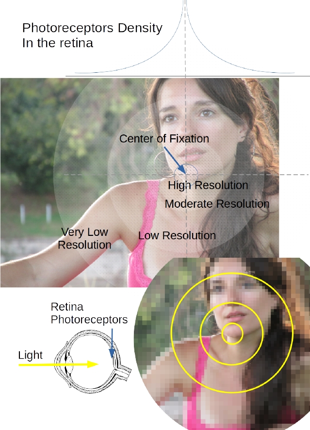 Fig. 1 Foveation in biological agents is a phenomenon in which the density of photoreceptors located on the eye’s retina varies in a way that there is acutely more density near the fovea, while such a density decreases drastically in the fovea’s vicinity. The fovea, is a small fraction of the retina which corresponds to the center of fixation in the sight. The consequence is that the perceptual detail regarded by the agent varies across the image according to the current fixation point, which confers the highest resolution region of the image to the center of the eye’s retina (i.e. the fovea)