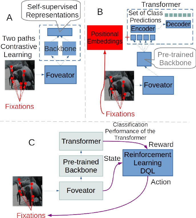 Fig. 2 Global strategic scheme to solve CV problems such as the labeled data sets scarcity and the high computational complexity demanded by the models implementation. (A) Self-supervised contrastive learning approach using foveated vision as an additional biologically-inspired augmentation strategy. With this strategy we aim to mitigate labeled data sets scarcity. (B) A transformer architecture processing a sequence of outputs from a pre-trained backbone which process foveated fixations. Positional embeddings are determined by individual fixations and not by image patches which saves great computing power demands from the transformer architecture perspective. (C) A Reinforcement Learning (RL) architecture–a Deep Q Network (DQN)–is added to the architecture to learn the saccadic behavior which is supposed to generate more effective fixation coordinates in order to increment the classification performance from the transformer