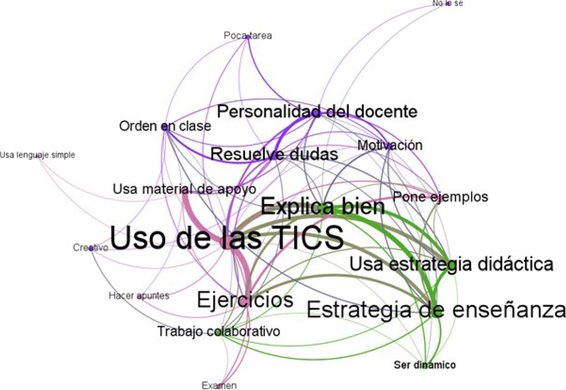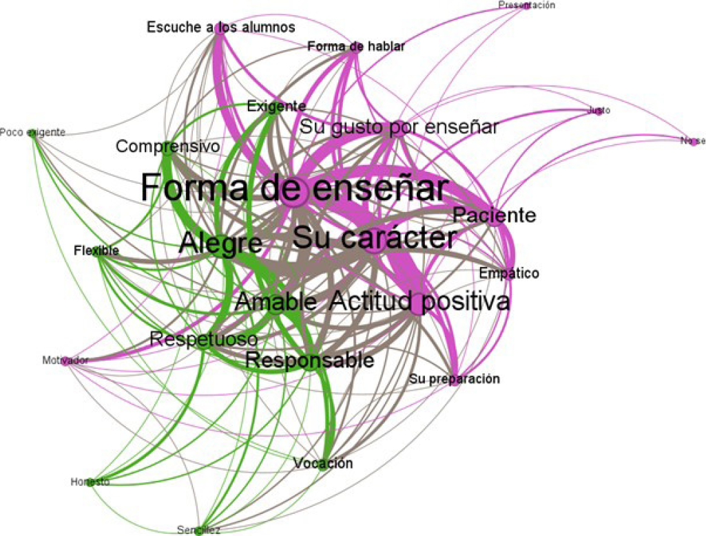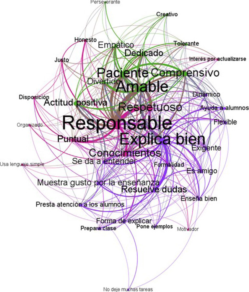 En la Figura 1 se observa que el análisis de redes sobre las características del buen docente se estructura sobre tres módulos que indican grupos de ideas centrales. En las del color magenta se destaca “responsable”, en la violeta, “explica bien” y en verde “amable”. La idea central “amable” se construye con otras ideas como: respetuoso, paciente y comprensivo. Se observa que la responsabilidad está fuertemente relacionada con la puntualidad y conocimientos. Por otro lado, la idea de explicar bien se construye a partir de: resolver dudas, darse a entender, ser exigente, mostrar gusto por la enseñanza y ser dinámico.