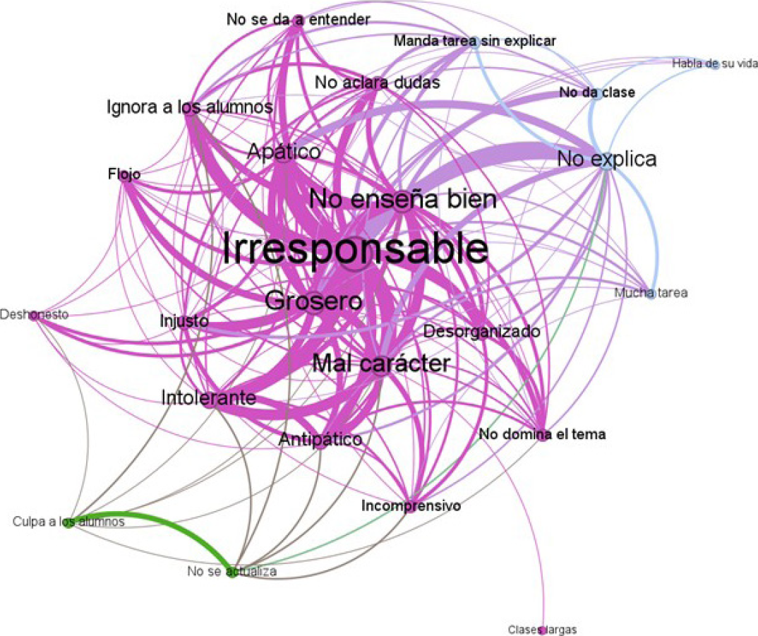 El análisis de redes sobre la representación social de un mal docente (Figura 3) muestra que la RS se construye sobre tres módulos de los cuales el relacionado con la irresponsabilidad (en magenta) es dominante. “No explicar” (en azul) y “culpar a sus alumnos” (en verde) aparecen de manera periférica. La irresponsabilidad se relaciona con: tener mal carácter, ser grosero y no explicar bien. En general, estos resultados son congruentes con la pregunta anterior.