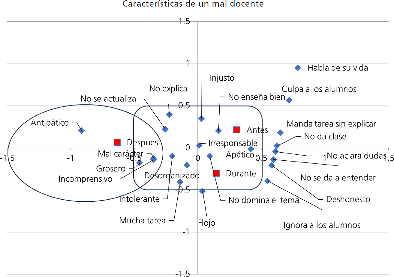 En cuanto a las diferencias entre las características de un mal docente antes, durante y después de la pandemia, el análisis de correspondencias muestra diferencia solo después de ella. Se observa que en este momento lo más relevante para identificar a un mal docente es el “mal carácter”. En congruencia con los resultados de las características de un buen docente, después de la pandemia se mencionan más sus aspectos afectivos y actitudinales. En los tres momentos, los elementos centrales de la RS de un mal docente son que sea irresponsable, no domine el tema ni enseñe bien (Figura 4). Esto es congruente con las ideas planteadas en el análisis de la RS del buen docente y hace referencia a un nivel 1 de enseñanza de acuerdo con el modelo 3P de Biggs (2005).
