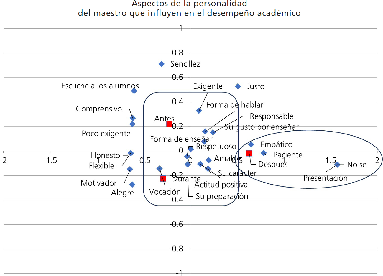 Figura 6 Análisis de correspondencias para los aspectos de la personalidad del maestro que influyen en el desempeño académico