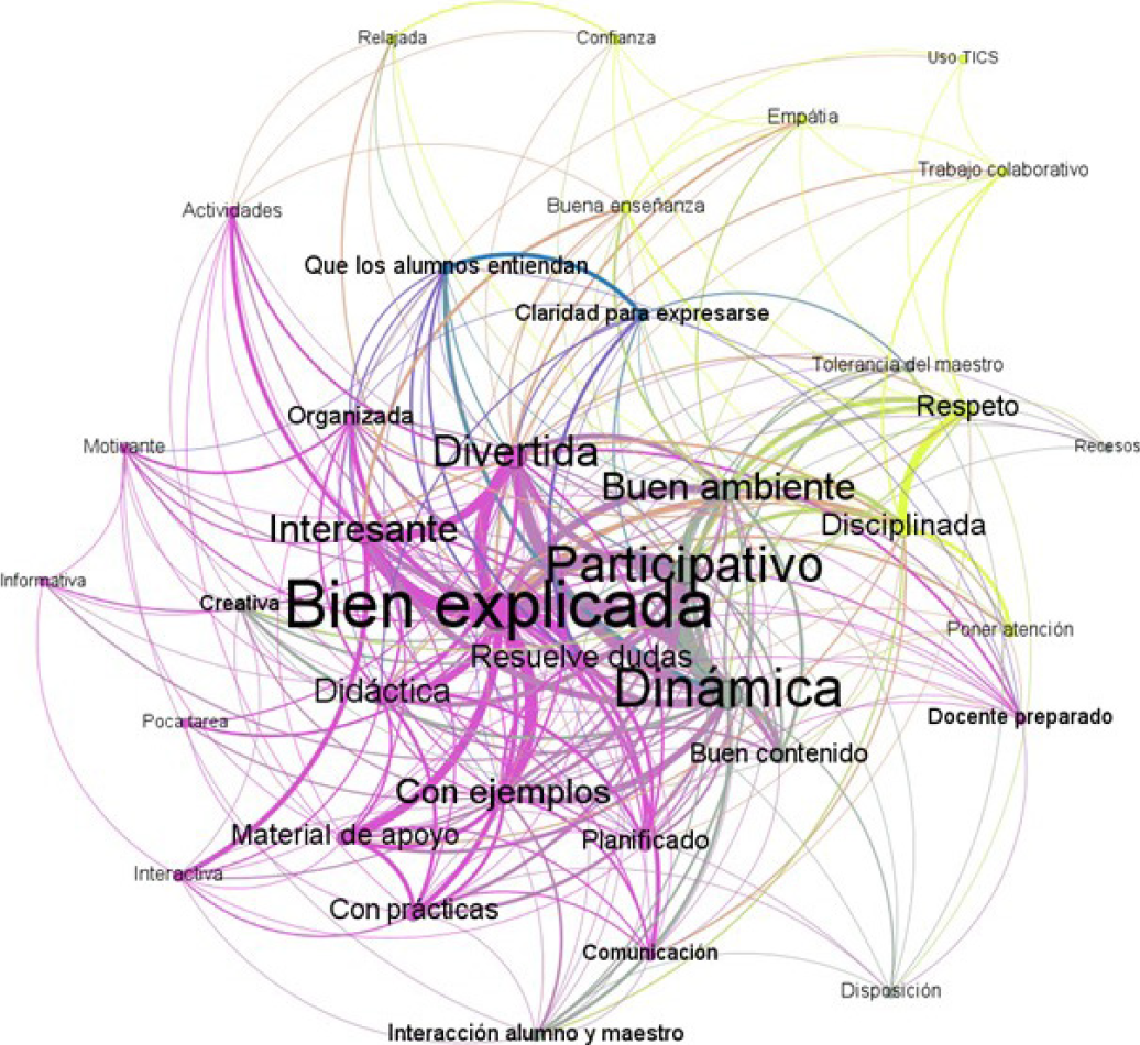 Los resultados del análisis de redes sobre la RS de los elementos de una buena clase (Figura 9) muestran cuatro dimensiones. La primera (en magenta) está conformada por una clase bien explicada, que sea interesante, se resuelvan dudas, se utilicen ejemplos, se realicen prácticas, se use material didáctico, etc. La segunda (en gris) se relaciona con el ambiente, que debe ser dinámico y participativo. La tercera (en amarillo) señala el papel de los estudiantes dentro de la clase, donde deben ser disciplinados, respetuosos, poner atención, trabajar de manera colaborativa, etc. Finalmente, en azul, se considera importante la claridad de expresión del docente. En general, se observa que para los estudiantes no solo es importante que las clases sean interesantes o dinámicas, también desempeña un papel importante cómo se sienten interactuando dentro del entorno de aprendizaje.