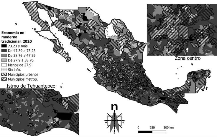 En México, durante el año 2020, 39 por ciento de la población ocupada se encontraba en la economía no moderna tradicional; en los municipios que forman parte de zonas metropolitanas, 35 por ciento; en municipios urbanos (excluyendo los metropolitanos), 42 y 50 por ciento en municipios rurales (también excluyendo los metropolitanos).