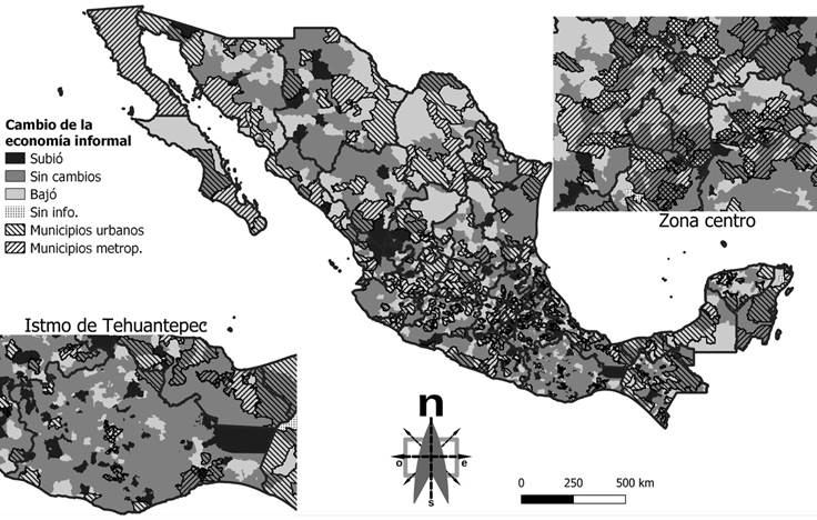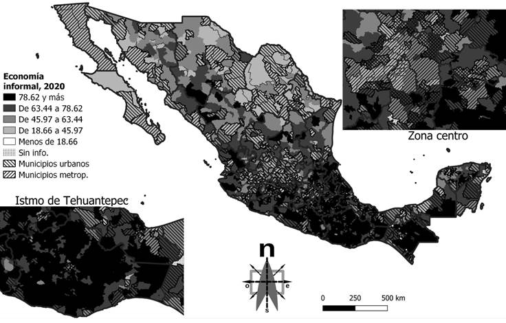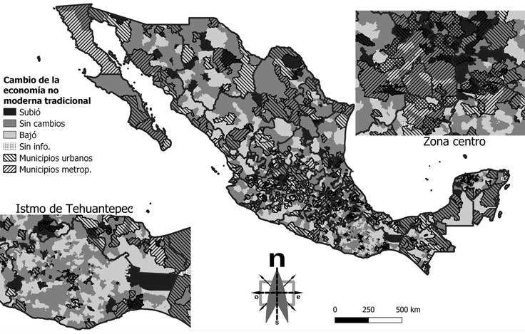 También se aprecia que la economía no moderna tradicional (ENMT) tiene una presencia destacada principalmente en municipios de los estados de Guerrero, Oaxaca y Chiapas, aunque no de manera exclusiva. Algunos municipios de los estados del norte también muestran un porcentaje significativo de población ocupada en la ENMT. Parece haber una correlación entre la baja proporción de población ocupada en la ENMT y la ubicación en estados del norte o en municipios metropolitanos del país, como se evidencia en Baja California, Coahuila, Nuevo León y la megalópolis de la Ciudad de México, así como en la mayoría de las zonas metropolitanas. En el mismo Mapa 1, los municipios urbanos y posiblemente metropolitanos están identificados por diagonales inclinadas a la izquierda (\\\); se observa que la mayoría se sitúa en niveles que oscilan entre 27.9 y 38.76 por ciento, es decir, en rangos intermedios de población ocupada que podría considerarse parte de la ENMT. Es importante destacar que en ambos casos también se encuentra presente la economía informal.