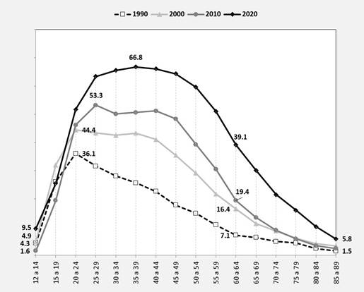 En la Figura 3 puede observarse que en 1990 la tasa laboral más alta fue de mujeres en el rango de 20 a 24 años (36.1 por ciento), para luego presentar una abrupta caída en los siguientes grupos de edad. Lo mismo sucedió en la siguiente década, aunque la tasa fue más alta (44.4 por ciento) y la caída fue más suave. En el año 2010 se recorrió la tasa de participación más alta al grupo de mujeres de 25 a 29 años (53.3 por ciento), suavizando aún más su decremento en los siguientes grupos. En el año 2020 el grupo de mujeres de más alta participación fue el de aquellas con edad entre 35 y 39 años (66.8 por ciento). Además, en ese año pueden observarse otros dos aspectos relevantes, primero, todos los grupos, excepto el de 15 a 19 años, mostraron tasas superiores respecto a los años censales anteriores. Segundo, no hay un quiebre abrupto en la cúspide de la curva, es decir, las mujeres tienden a mantener tasas altas de participación durante su ciclo de vida, el cual dura hasta los 60 años con la perspectiva de lograr la edad de jubilación y a partir de ahí hay una tendencia a disminuir. En gran medida, eso se debe también a que las mujeres que se incorporaron en los años noventa continuaron trabajando en las siguientes décadas, a diferencia de sus generaciones anteriores, que salían más rápido del mercado laboral.