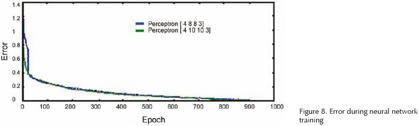 Figure 8 shows the way as the error decreases, and it can be seen that there is not an important difference among the obtained errors when the number of neurons in the hidden layers is bigger than eight. So that, the neural network that is considered as suitable for using in the proposed intelligent classifier should have at less eight neurons in the hidden layers. For validating the network performance two types of inputs were tested, signals previously used during the training and signals not used for the training process.