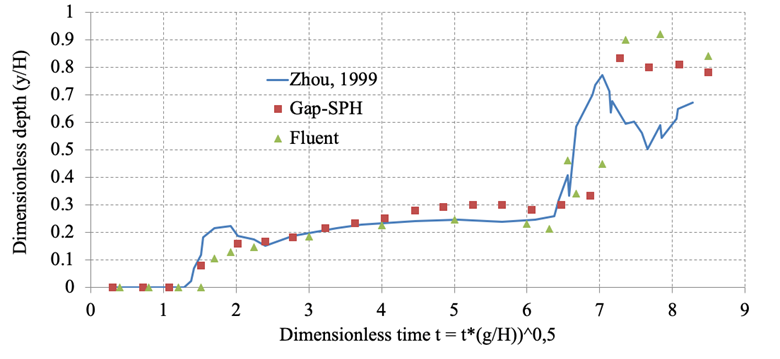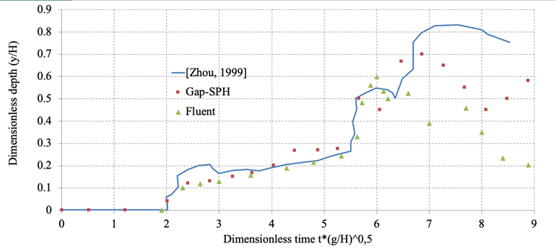 The FVM method is Eulerian, and therefore the driving equations are dependent upon a series of fixed nodes that form a mesh that must fill the continuum. In this type of cases, since there is a free surface, dynamic remeshing algorithms are required so that the FVM can handle the free boundary, which is in itself a challenge and a serious computational expense and may interfere with modeling accuracy. However, as mentioned above, mesh-based methods are very common in numerical modeling of fluid flow and both researchers and practitioners use results generated with the FVM as a benchmark to assess accuracy, efficiency and versatility of other methods. The numerical modeling by (Zhou et al., 1999) for this case is shown here for that purpose. For an introductory discussion on the application of the FVM to computational fluid dynamics (Blazek, 2015) is an appropriate starting point since it covers its mathematical formulation, commonly used algorithms, advantages and limitations, along with references to more detailed publications on the topic.