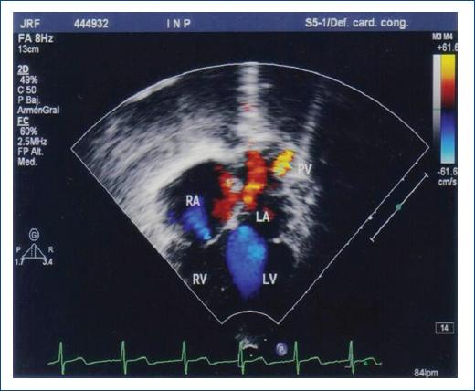 Figura 1 Ecocardiograma en color bidimensional, en el cual se observa una turbulencia en color en la vena pulmonar izquierda y crecimiento de las cavidades derechas. LA: atrio izquierdo; LV: ventrículo izquierdo; RA: atrio derecho; RV: ventrículo derecho; PV: vena pulmonar.