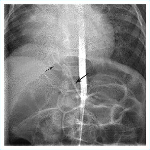 Figura 2 En el cateterismo cardiaco se observa una fístula arterial derecha (flecha gruesa) que emerge de la aorta abdominal hacia la base pulmonar derecha (secuestro) (flecha fina).