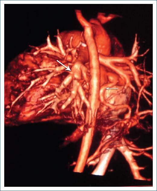 El ultrasonido abdominal mostró un vaso aberrante con origen en la aorta abdominal por arriba del tronco celíaco, y fístulas arteriovenosas confirmadas.
