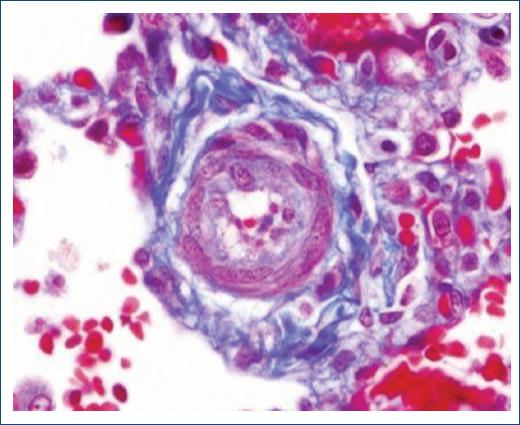 La ECVP es un proceso patológico de engrosamiento muscular, proliferación-tortuosidad miofibroblástica de la neoíntima y alteración en la matríz extracelular, aumento de factor plaquetario, de factor vascular endotelial y de fibroblastos, con activación de receptores de la tirosina cinasa e hipertensión arterial pulmonar14,15.